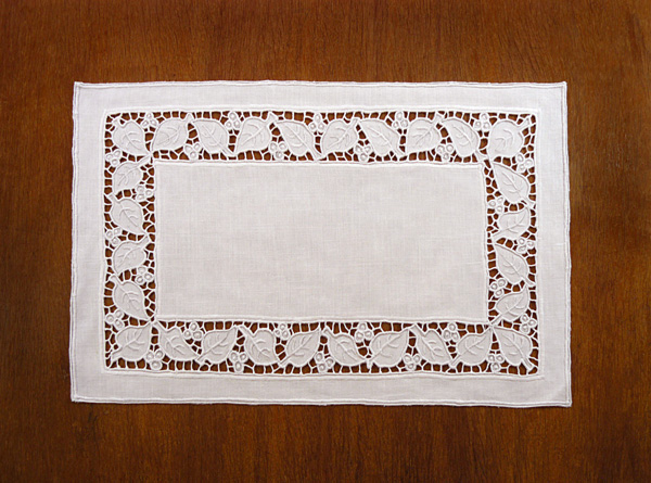 Descrição: FORRO DE BANDEJA BORDADO RICHELIEU FOLHAS Código: FB016 Tecido: Linho Tamanho: 42 x 29 cm Cor: Branco